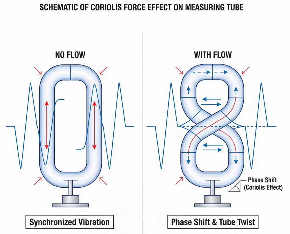 Участие силы Кориолиса: Когда жидкость или газ начинает течь через вибрирующие трубки с высокой скоростью, движущиеся частицы жидкости по инерции пытаются сопротивляться периодической вибрации трубок. На впускной стороне жидкость сопротивляется отталкиванию от центра вибрации; на выпускной стороне он сопротивляется вытягиванию назад. Эта сила взаимодействия известна в физике как «сила Кориолиса».